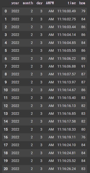 col = ["year", "month", "day", "AMPM","time","bpm"]