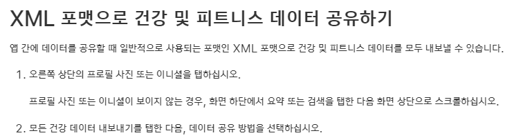 위 페이지로 들어가서 iPhone의 건강 앱에서 데이터 공유하기 페이지를 검색해서 찾아가면, 최하단에 XML 포맷으로 건강 및 피트니스 데이터 공유하기 메뉴를 찾을 수 있습니다.