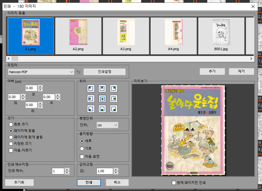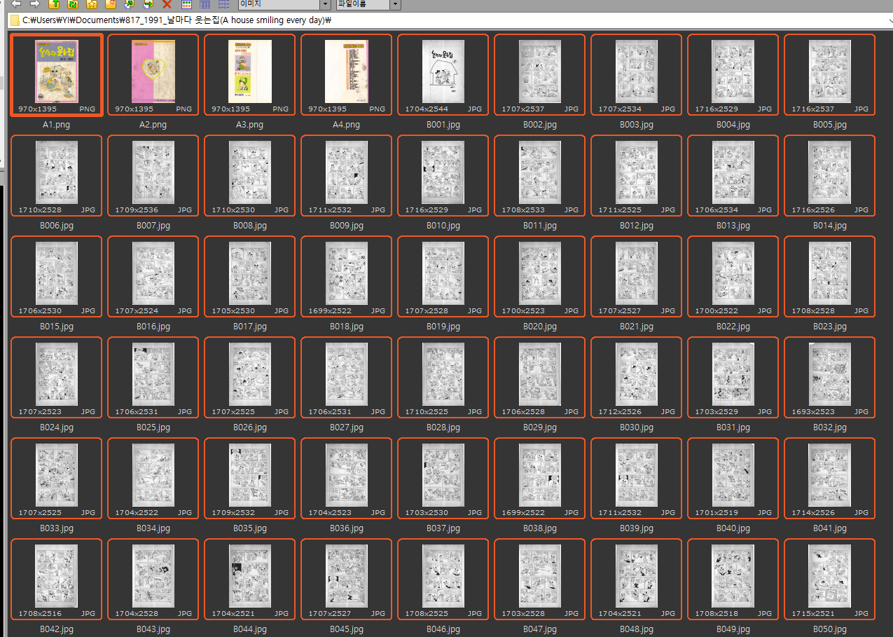 - 이미지 파일 그대로 보관하면 나중에 볼 때 불편하기 때문에 pdf로 보관하게 좋습니다. 변화과정에 대해 간략하게 설명해볼께요. 아래의 책은 타계하신 신문수 화백님의 날마다 웃는집이고, 이 책을 예로 설명을 진행하겠습니다.