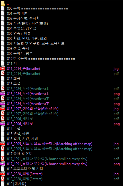 - 문제는 책을 어떻게 분류 기준을 어떻게 잡을지인데, 이와 같은 정리를 위해 한국십진분류법이 있으므로 이에 따르기로 했습니다. 각 책의 분류기호는 국가자료종합목록에서 조회할 수 있구요. 여기서 날마다 웃는 집을 검색하면 분류기호가 817인 것을 알 수 있습니다.
